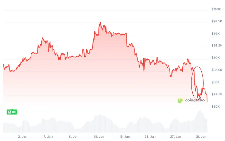 The pressure was particularly acute in BTC and major altcoins. Following the announcement of Warsh’s nomination, U.S.-listed spot BTC ETFs recorded a single-day net outflow of more than USD$800m (according to Binance), and BTC fell sharply from USD84,000 to USD78,000, a decline of over 7% in a short window. The move was even more severe across other large-cap tokens: ETH dropped roughly 12%, while SOL declined by about 13%, reflecting both beta amplification and weaker liquidity conditions. The rapid price correction pushed a large cohort of leveraged positions into liquidation territory, triggering forced unwinds on derivatives venues and perpetuating a negative feedback loop of falling prices, shrinking collateral values, and further margin calls.