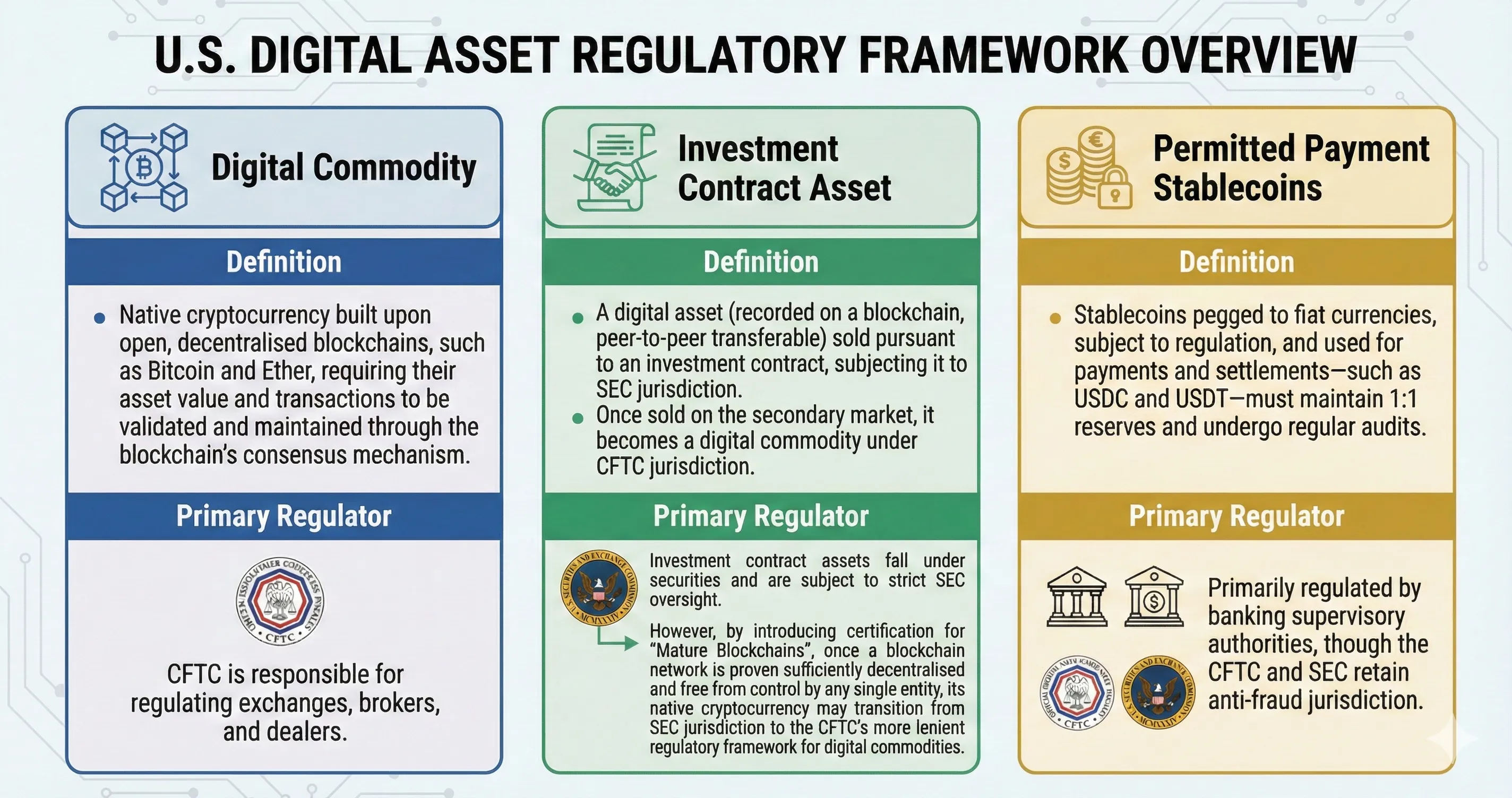 Investment contract assets fall under securities and are subject to strict SEC oversight. However, by introducing certification for “Mature Blockchains,” once a blockchain network is proven sufficiently decentralised and free from control by any single entity, its native cryptocurrency may transition from SEC jurisdiction to the CFTC's more lenient regulatory framework for digital commodities. |