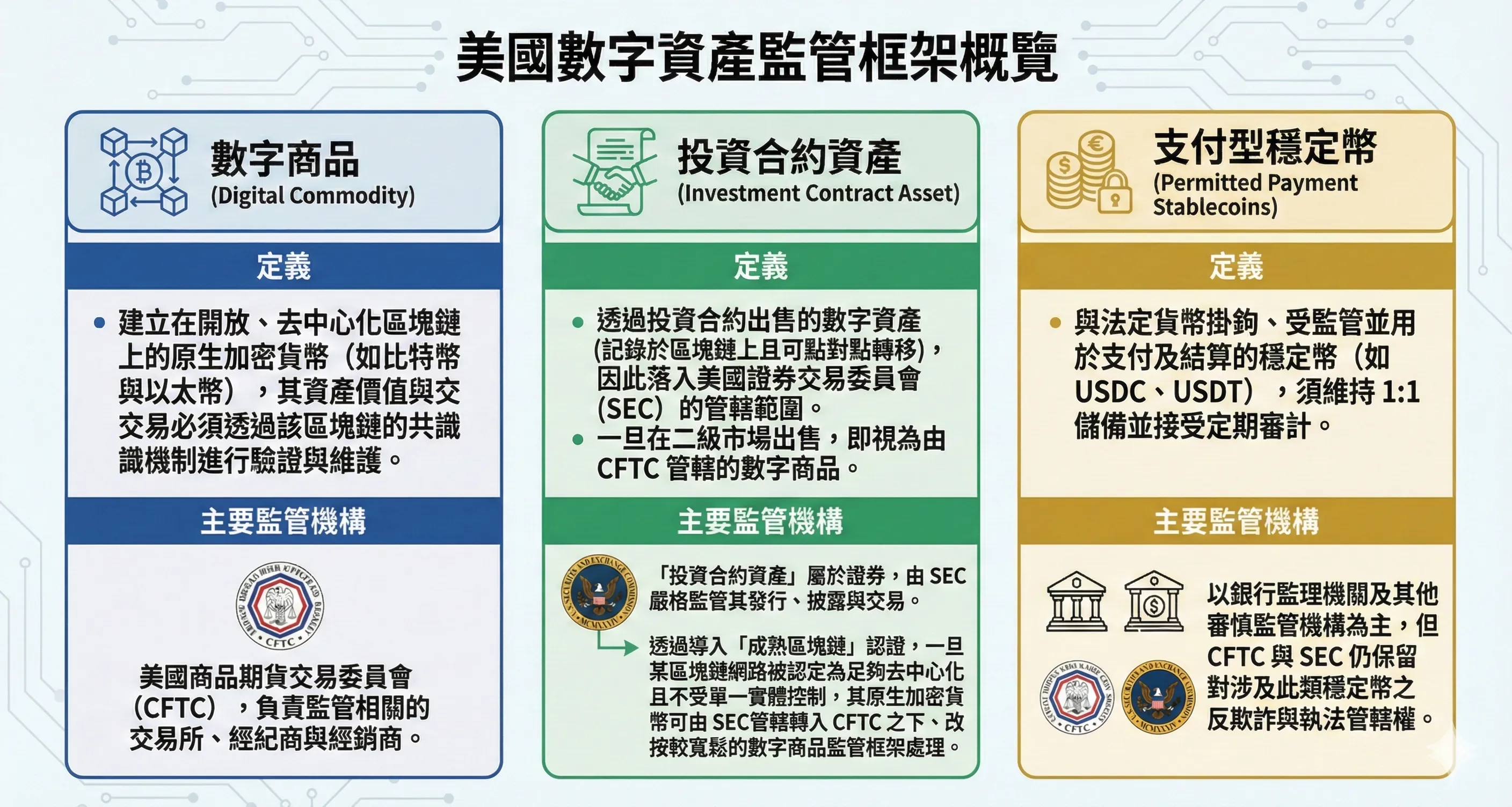 「投資合約資產」屬於證券,歸SEC嚴管。 但透過引入「成熟區塊鏈」認證,一旦該區塊網路被證明足夠去中心化、不受單一實體控制,其原生加密貨幣便可從SEC管轄轉為CFTC較寬鬆的「數字商品」監管框架。 |